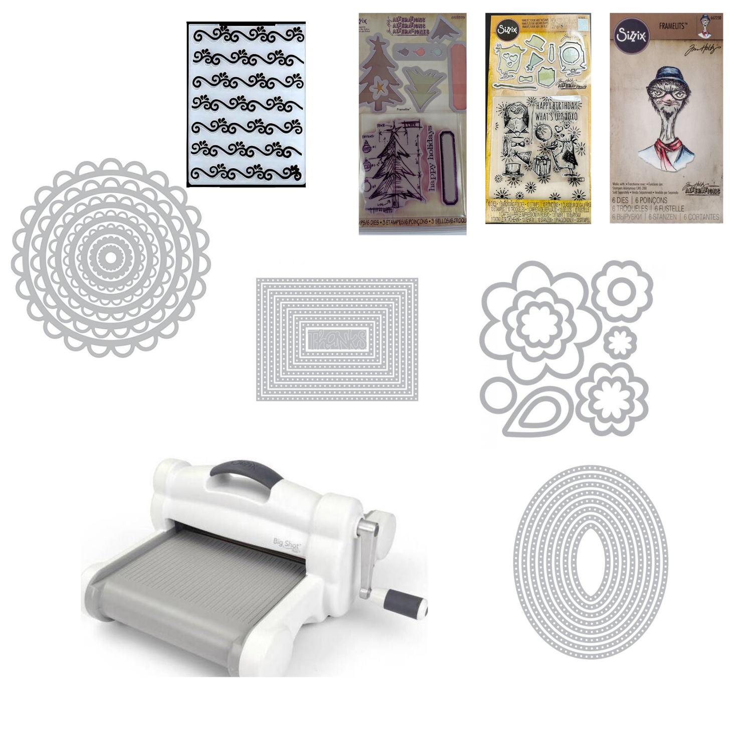 Troqueladora mundialmente famosa. La mas antigua y mejor marca para troquelar manual con matrices. Este kit unico de Liquicraft-Liquidadora de Manualidades-incluye la máquina Big Shot normal de Sizzix (660200) para cortes y embossing o relieve de tamaño hasta 15*30 cm ( dependiendo de las matrices), incluye matrices de corte: 659379 (tipo framelits con 6 cortadores y timbres a juego)-662497 (matriz de corte tipo framelits incluye 10 cortadores y timbres a juego)-661665 matriz de corte tipo framelits incluye 6 cortadores y timbres a juego). Además incluye framelits 560021,561561,561840 y 558692 y la matriz de embossing EMFOLD17 (grecas)